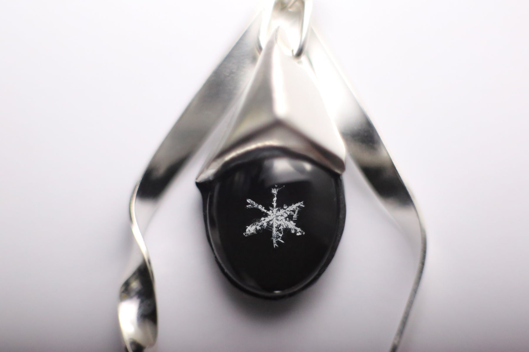 This design was inspired by the Northern Lights, the greatest show on Earth. The black center-piece with the preserved snowflake represents a winter night, and it’s surrounded by a ribbon whose organic shape is reminiscent of the Aurora Borealis.