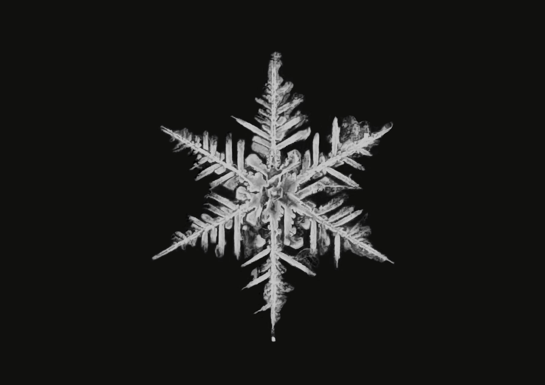 Intricate 6.9 mm snowflake with classic angular shape, harvested in January 2024 in Yellowknife, Northwest Territories.