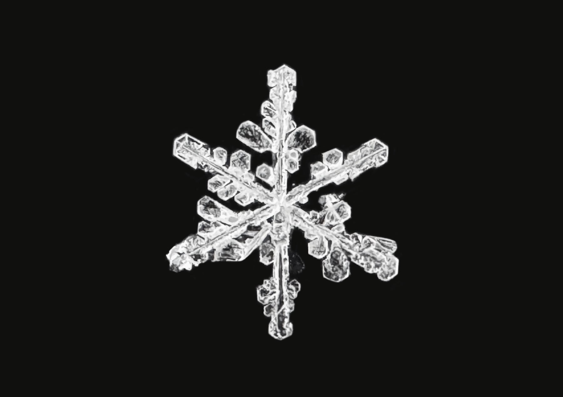 Intricate 6.9 mm snowflake with classic angular shape, harvested in January 2024 in Yellowknife, Northwest Territories.